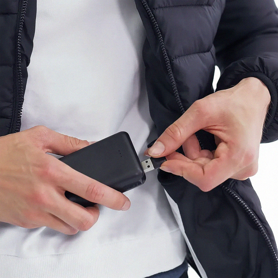 The jacket works with any power bank with USB connection, so you can use what you already have at home.