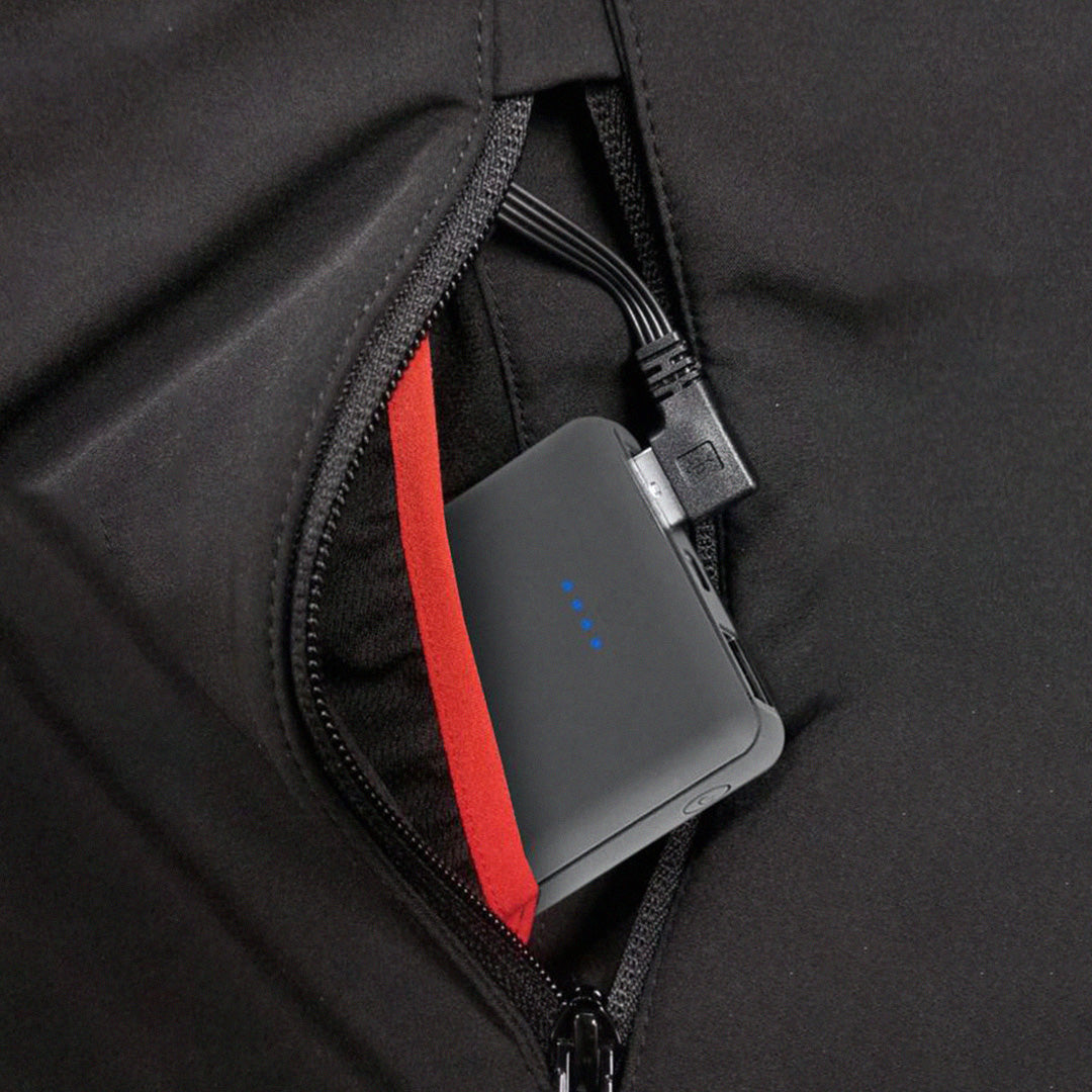 The jacket weighs approximately 1kg without the power bank, making it lightweight and comfortable for all-day wear.